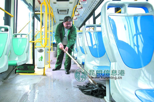 工作人员改用拖把清洁公交车。记者郎晓伟/摄