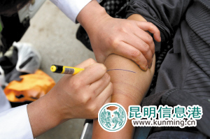 检查结束后,王云山用手术刀片在杨家才的伤口附近切开几个小口,并将原来的放血创口扩大,同时还在手肘处切开了一处新的创口。“把创口切大,将里头的淤血引流出来,这样他的手臂能快速消肿。”