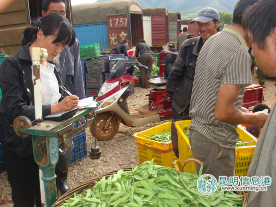 每天清晨5、6点,熙熙攘攘的荷兰豆交易市场会第一时间把沉寂了一个夜晚的山村打破,一箩箩新鲜翠绿的荷兰豆吸引了滇源、创造、绿色、晨农等数家大公司前往收购,产品远销日本、台湾等地。为方便豆农交易,晋宁县相继建成六街镇、双河乡等4个交易市场。豆农们高兴的说:“我们卖豆不用到很远的地方去,只管种好豆,不愁销路,在家门口就把豆卖了,把钱赚了”。