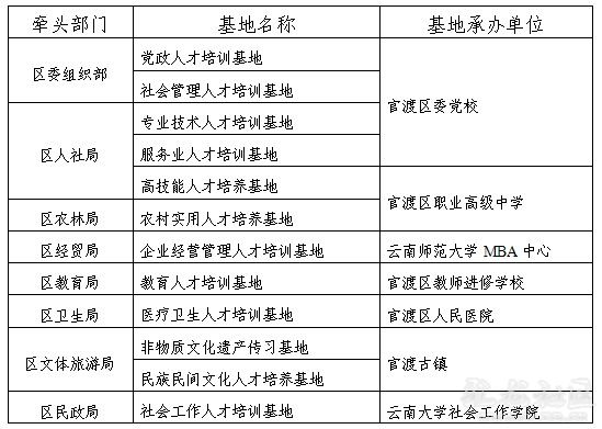 在官渡区委组织部的牵头抓总下,官渡区人社局、教育局、卫生局、文体旅游局、经贸局、农林局、民政局认真履行职能职责,积极主动与省内高校、区委党校、职业学校、旅游景区、教师进修学校、医疗机构等各级各类教育培训机构联系,建立起社会管理人才、服务业人才、非物质文化遗产传承人、民族民间文化人才、教育人才、医疗卫生人才、党政人才、企业经营管理人才、专业技术人才、高技能人才、农村实用人才、社会工作人才共十二个人才培养(培训、实训)基地,使人才队伍建设有了坚实载体。