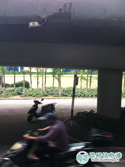 市民在悬空的水泥块下穿行,十分危险 记者 程浩/摄