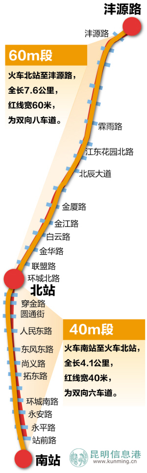 据昆明市住建局介绍,北京路从设计上将突出以下五大方面:突出交通功能针对性。坚持常规公交支持轨道交通的原则,合理布置公交站点,控制换乘距离在100米以内。根据现状道路断面,合理确定道路中心线,保证人行道有效宽度不小于3米。其中,火车南站到火车北站4.1公里的路段,道路红线宽40米,恢复提升后将保证双向行车道为六车道;火车北站到沣源路7.6公里的路段,道路红线宽60米,要确保该路段为双向八车道。