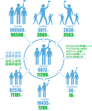 昆明市旅游局统计数据显示,今年上半年昆明共接待旅游团队109569个,其中出境3811个团队,入境2838个团队,国内团队9873个,省内团队82576个,一日游团队10435个,边境游团队36个。而去年上半年,昆明纳入监测的旅行社一共接待96500个团队,接待团队游客173.38万人次,团队平均行程天数为5.72天,每团平均人数18人。调用导游3.94万人次,调用车辆2.16万辆。 出境3085个团,入境3563个团,国内11288个团,省内71191个团,一日游7289个团,边境游16个团。