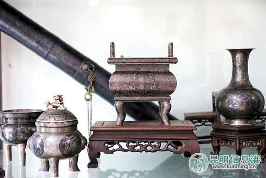 从那以后,老金的思路终于换了过来。如今,他开了公司,收了6个徒弟,对照“云南乌铜走银”六个字,他把徒弟们的艺名命为“金云、金南、金乌……”他说,他还要再收8个徒弟,凑成14个,刚好对照他的公司“云南乌铜走银文化产业有限公司”。那么,徒弟的艺名,最后三个就变成“金限”、“金公”和“金司”了。
