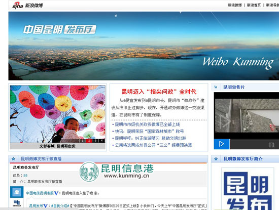 作为昆明市党政机关发布党务政务信息和密切联系群众的微博平台,“中国昆明发布厅”一方面聚合了昆明市所有党政机关和部门的官方微博,同步显示各部门最新公布的党务政务信息,另一方面,“中国昆明发布厅” 还将通过视频、图片、文字等多种媒体形式,全面宣传提升昆明城市形象。