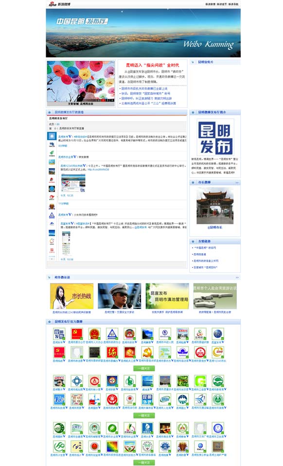 昆明信息港讯 记者韩焕玉 昆明市政务公开、政民互动的新媒体平台——“中国昆明发布厅”微博群(点击进入>>>)今日上午正式开通上线。该平台聚合了市级各部门和市属各县(市、区)96个党务政务微博,将通过资源整合、纵横联动、抱团运转的模式,推动昆明市党务政务信息公开向更多发布领域、更大受众范围、更高传播效率方向发展。