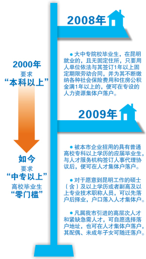 “为了鼓励人才来昆工作,我市近年来一直降低落户门槛。”吴迪介绍,当前,昆明市引进人才落户服务已可以满足多层次人才的落户需求。尤其在落户的学历“门槛”上,已由2000年时的“本科以上”降低到“中专以上”,对高校毕业生来说,在政策层面可以说是零门槛。