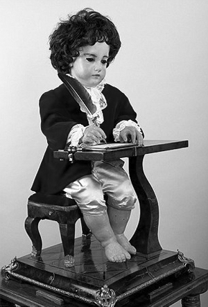 名叫“作家”的“写字机器人”已有240年的历史,它是由瑞士钟表匠皮埃尔·雅奎特-德罗兹和他的两个儿子亨利-路易斯、让-弗里德里克·莱斯肖特在18世纪70年代制造出来的。“写字机器人”的外表看起来像个3岁的男孩玩偶,不可思议的是,当“写字机器人”背后的发条被上紧后,它就会抬起右臂,将手中的鹅毛笔伸到桌子右侧的墨水壶中蘸一下,然后在桌子当中的白纸上缓缓写出几行词句。据悉,“写字机器人”写出的词句最多可以包含40多个字母。
