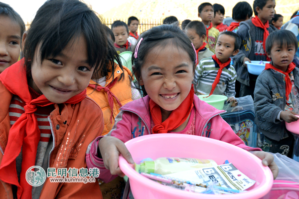 捐赠仪式上,贝因美昆明分公司的员工将特地选购的爱心物资一一递交到孩子们的手上。此次捐赠物资包括篮球排球跳绳等体育用品,60本新华字典,60套学生套尺,60个书包、笔袋、推笔刀等学习用品,以及洗脸盆、毛巾、洗护套装等生活用品,基本做到了孩子们人手一份。看着到手的新文具和日用品,孩子们露出了甜美的幸福笑容。