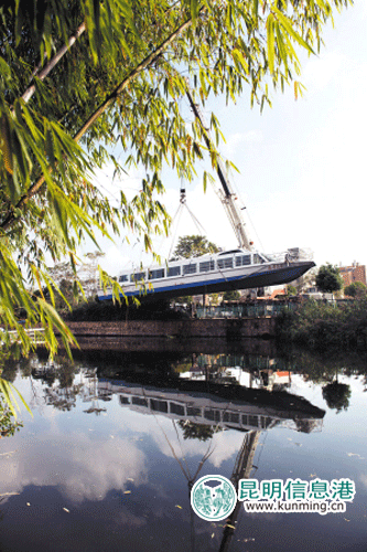 载着客船的挂车停靠在航运码头对面河边,此后吊车对客船进行起吊并放入大观河。两艘客船分别为滇华8号、9号。停放在货车上的客船,其白色的外观看上去很是气派。每艘船在起吊入水前,都会在船头燃放鞭炮。