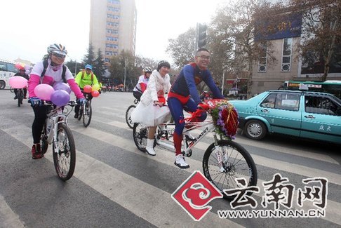 每个女孩都有一个梦想,那就是举办一场浪漫而又有纪念意义的婚礼。而昨天,昆明一对小年轻就举行了这样一个既浪漫又环保的自行车骑行婚礼,这不仅让他们毕生难忘,也羡煞不少的小伙伴,小伙伴们都表示将来也要办一个像这样有意义的婚礼……