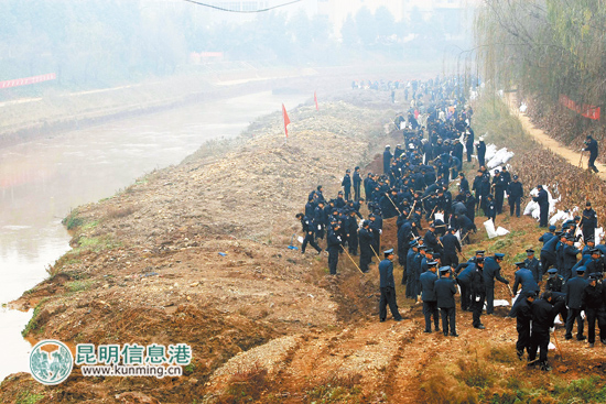 昨日上午9点半,在禄劝掌鸠河县城段的东山桥边,“保护母亲河 全民共参与”、“加强河道综合整治 创和谐人居环境”等标语悬挂在掌鸠河河道两侧,此时的气温只有0摄氏度,寒意十足。掌鸠河一边的堤岸上,却是一派热火朝天的场面:数百名禄劝干部职工顶着寒风,奋力挥下手中的锄头,将河岸中常年淤积的泥土挖起,装入防洪袋中堆放到岸边,每个人都积极投入、干劲十足。据了解,全县3000余名干部职工分为4组,分别在两天时间里分段完成清淤工作。禄劝县水务局局长李庭裕介绍:“本次进行的掌鸠河清淤活动,是多年以来规模最大的一次,主要通过机械挖掘,在枯水期内抓紧清理河底淤泥,明年春节前,完成掌鸠河县城段3公里和南塘河1公里河道内7.2万立方米淤泥清除,掌鸠河县城段的防洪、泄洪能力将大大提高。”清淤工作完成后,禄劝将投资800余万元,在掌鸠河东山桥边建起一座如同瀑布的景观闸门,通过调整、控制河流水位,届时将形成掌鸠河县城段10余公里绿化长廊及河道“水清岸绿”的靓丽景观。