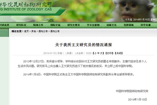 15日晚间,中科院昆明动物研究所在其网站显著位置加挂上了“关于我所王文研究员的情况通报”。通报称,2013年12月27日,中科院动物研究所部分领导、学科组长收到针对王文研究员的匿名举报邮件,主要内容涉及其个人生活作风问题。研究所马上向当事人王文研究员进行了相关情况的核实,并立即上报中国科学院。2014年1月9日,中国科学院正式免去王文中国科学院昆明动物研究所副所长等全部领导职务。