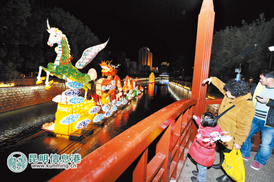 昨晚,盘龙江灯会以山茶花和马年新春为主题的13组河灯正在进行调试,引得市民驻足观看,纷纷留影。这些河灯将于明天正式亮灯,至2月20日,市民每晚8:00到10:00可在圆通大桥至南太桥段盘龙江面欣赏。喜庆热闹的盘龙江灯会与整治后清澈干净的盘龙江相得益彰,形成流光溢彩的盘江水景。昆明日报 记者王俊星/摄