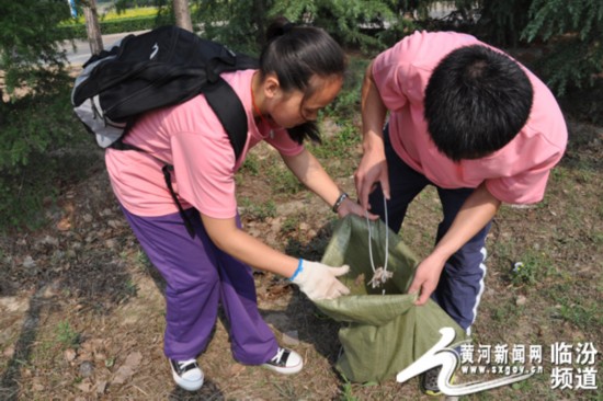 临汾志愿者们在市区街头捡拾纸片废物,倡导环境保护
