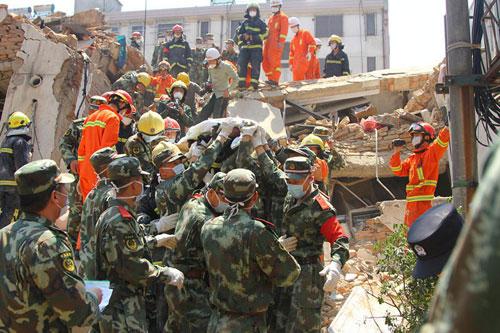 消防队员从坍塌楼房现场营救被困者。(图片来源:武警宁波支队 毕承启 殷福军)