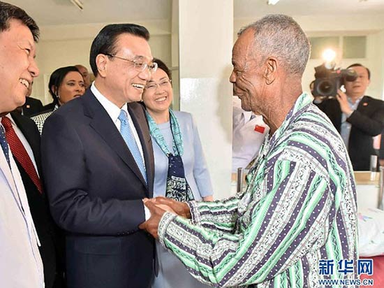 5月6日,中国国务院总理李克强与埃塞俄比亚总统穆拉图一同来到亚的斯亚贝巴阿勒塔医院,看望受益于中国免费白内障手术“光明行”活动的埃塞俄比亚患者。记者李涛/摄