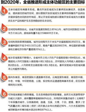 到2020年,云南省主体功能区布局基本形成,城市空间控制在3100平方千米以内,全省7个环保重点城市空气质量达到二级标准的天数占全年比例超过90%……日前,云南省政府正式印发《云南省主体功能区规划》,对未来全省土地空间开发作出总体部署,并根据全省不同区域的资源环境承载能力、现有开发密度和未来发展潜力,划分重点开发区域、限制开发区域和禁止开发区域3类主体功能区,逐步形成人口、经济、资源环境相协调的空间开发格局。