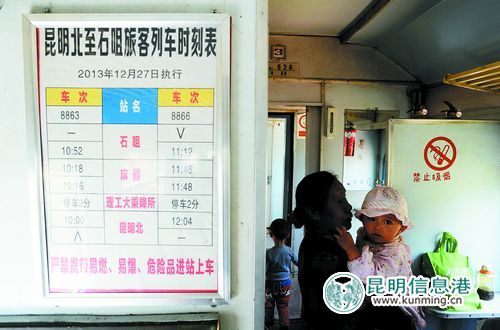 昆明北至石咀的旅客列车时刻表,每天早晨10点小火车从火车北站出发。记者周密/摄