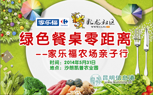“六一”将近,在这天气晴朗,阳光明媚的节日里,由昆明家乐福超市有限公司携手彩龙社区共同策划的“绿色餐桌零距离”亲子活动将在5月31日免费邀请25对亲子家庭前往沙朗凯普农业园系统全面的了解生态蔬菜的种植过程,并品尝生态午餐。让您与孩子度过一个快乐而有意义的六一儿童节。