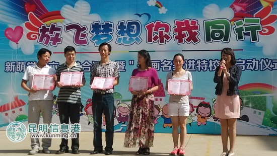 昆明信息港讯 记者张子源 “放飞梦想,你我同行。”5月30日,新萌学校的百余位师生及家长们载歌载舞、欢聚一堂,共同庆祝“六·一”儿童节。同时,“书画名家进特校”启动仪式也于当天举行。云南著名书法家、昆明书法家协会主席赵翼荣等6位著名书画名家现场接受学校聘书,担任学校的艺术教育顾问,为学校艺术教育教学工作增辉生色。