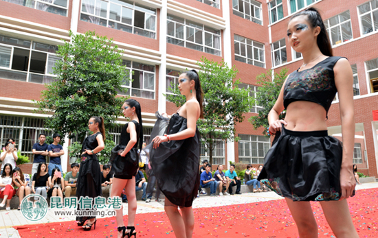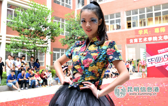 据介绍,本次毕业设计展涉及环境艺术设计、视觉传达设计、服装与服饰设计、动画设计、建筑景观动画方向等专业。在教学楼一条条治学标语下, 云南艺术学院文华学院2014届毕业生设计展的红色背景墙分外惹眼,一条红毯铺就的T台上,戏剧系模特班的帅哥美女穿着服装设计毕业生的作品正在走秀。以环保极简为主题的、以复古民族绣花配上墨绿色环保材质的、以太空棉为材料配上棉麻布料的、以少数民族绣片作花样的、以森林童话动物为原型的……各式各样的服装看得人眼花缭乱,应接不暇。当每组作品展示完,设计者亮相时,现场都会响起热烈的掌声,一捧捧鲜花、一个个毛绒玩具被送到手中。围观的学生将百平米的小广场围得里三层外三层,有的坐在地上看,有的夹在花坛边踮脚看,有的爬到楼上走廊往下看,有的校工孩子骑在爸爸脖子上看……