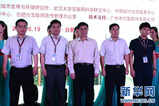 6月19日上午9时,新华网在安徽合肥隆重举行“城市网络形象排行榜(2013)”发布会,图为政务网络形象奖获奖城市代表。图片来源:新华网