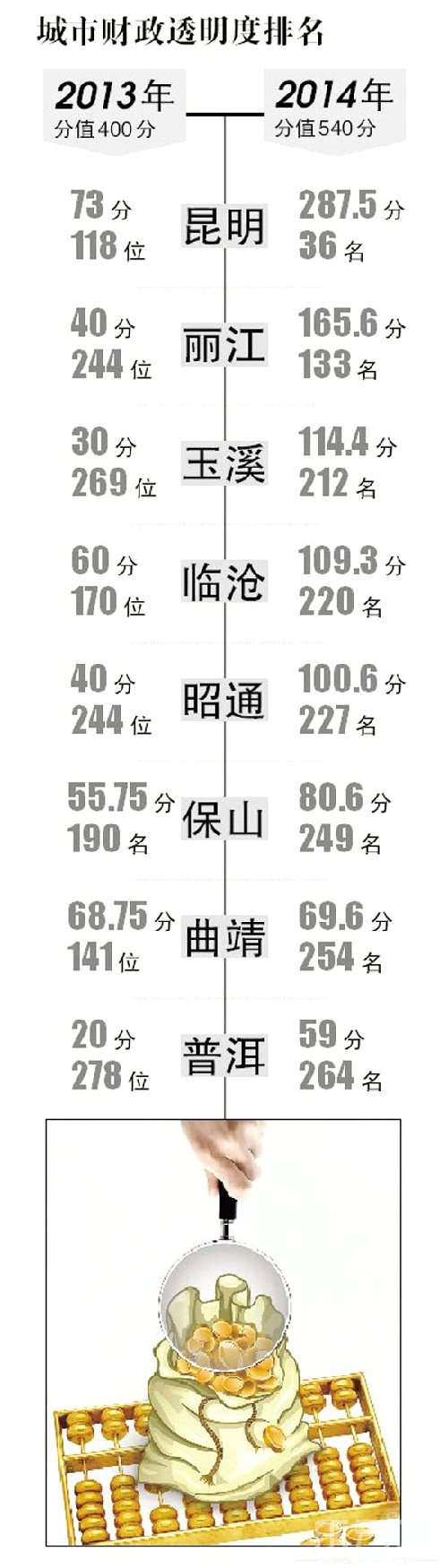 该课题组研究员王宇哲介绍,所有评价指标的打分都是根据各市的政府网站公布的信息来进行,去年昆明市得分较低的原因主要在于财政预决算信息公开不及时、财政预决算信息公开不够细致、忽略了其他一些重要的财政信息(如政府债务、国有企业的财政信息等),今年昆明市首次在网站上将公共财政、政府性基金、国有资本经营、社保基金这四本账全部公布了,这部分分值很高,直接拉高了分数及排名。