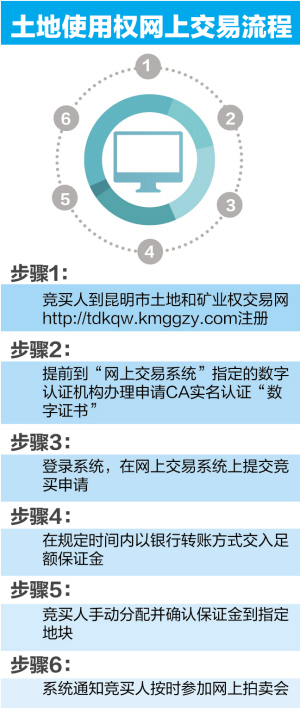 为此,我市将在主城区范围内先行启动国有建设用地使用权网上公开在线交易,取得经验后逐步扩大到县、区,力争到2018年全市全部实行网上交易。目前,市国土局开发建设昆明市土地和矿业权交易系统(以下简称:系统),并形成了国有建设用地使用权的网上招拍挂交易规范。