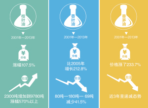 以下一组数据是云南主要的天然香料油从2001年到2013年出口量变化:桉叶油出口量从2300吨增加到9780吨,一直呈现上升趋势,数量增幅570%以上,价格涨幅107.5%;而香叶油2001年出口量80吨,到2004年达到最大值180吨,随后开始下降,2013年降低到69吨,与2001年相比减少41.5%,已经到正常偏低的水平,价格却比2005年增长212.8%;香茅油近3年呈递减态势,但价格涨了近233.7%。