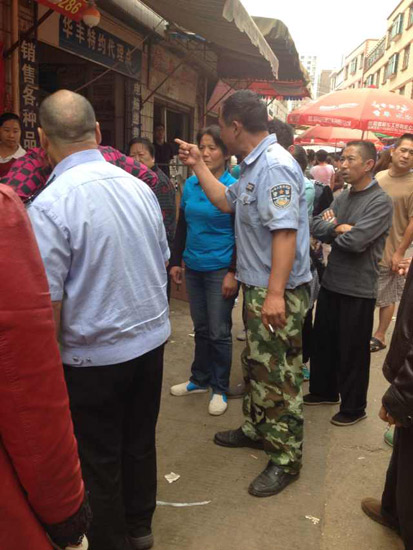 随后,在该市场管理办公室,记者找到了网友图片中所提到的那两位穿制服的男子。原来,那位背对镜头的中年男子叫保明爱,是市场办公室的负责人,其着装跟事发当天一样,上衣袖标有“治安”字样。那位穿迷彩裤的男子是这个市场的保安队长,他穿了一件右胸前印有警徽标志的黑色背心。