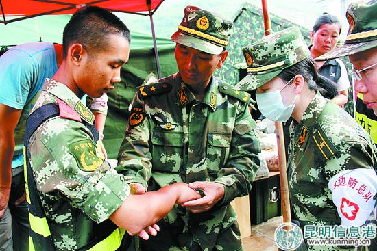 鲁甸地震灾区,陈本善给救援时受伤的战士诊治。供图