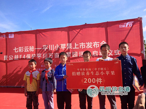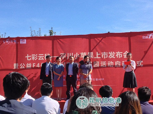 昆明信息港讯 实习记者罗婉宁 9月27日,七彩云秘平川小苹果上市发布会暨公益F4发起保护平川万亩苹果园活动启动仪式在宾川县平川镇举行。七彩云秘联合创始人孙永斌、孙立刚、樊瑞,香港宣祥实业集团董事局主席、麻袋公益APP创始人葛宏女士组建公益F4首次亮相,并号召更多的公益力量加入公益F4,助力云南山区果农创富之路,共同关注果农经济收入。