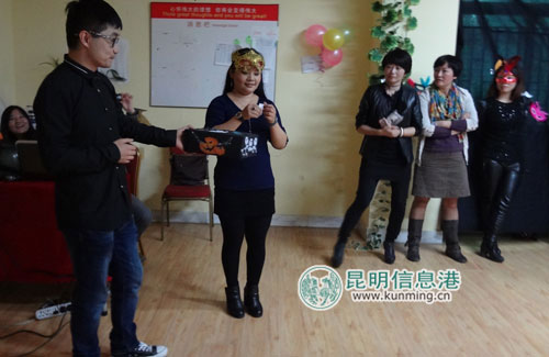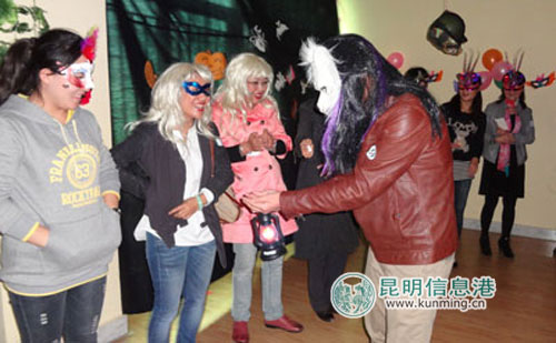 装扮成万圣节妖怪的学员正在玩“trick-or-treat”的游戏。记者张薇/摄
