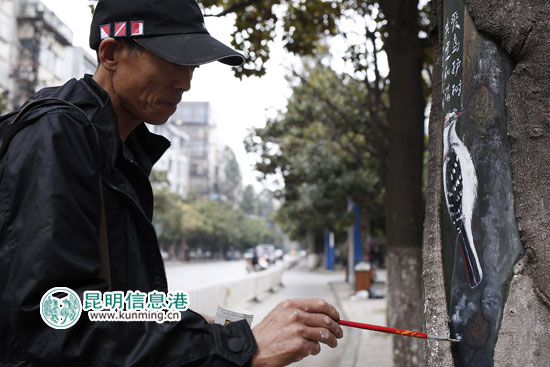 “东北现在都零下了,昆明还那么温暖,真是名副其实的春城。”孙松岩说,“我住的宾馆就在这(新闻路)附近,我注意到这里有几棵树树皮掉了,很适合在上面作画,所以今早就临时买了丙烯画原料来作画。希望这两棵树能好好生长,也期望下次再来昆明。”
