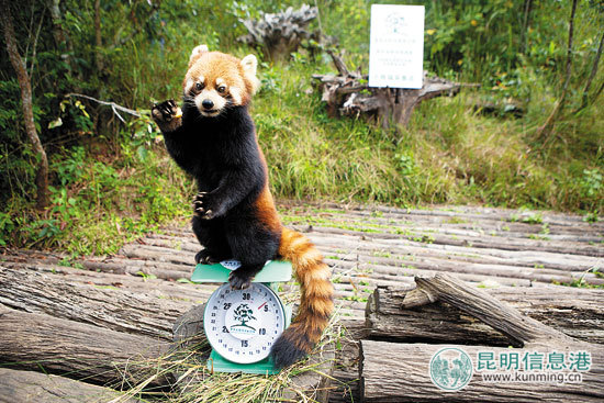 普洱太阳河国家公园小熊猫栖息地一共有36只小熊猫,将分批次在一个月内采集完成。采集小组组长缪志选介绍:“小熊猫的采集是根据小熊猫本来的特点来进行引导的。小熊猫喜欢抱人的大腿,身长可通过这个方法测量;而小熊猫喜爱吃苹果,站立取食的能力比较强,因此用苹果就可以把小熊猫引到秤上站立,顺利测得体重。”