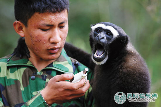 接着,采集小组来到长臂猿栖息地。当天对栖息地的其中4只长臂猿的血压、臂力、智力进行了测试。测试由常年给长臂猿提供人工补给的观察员金工文配合进行。