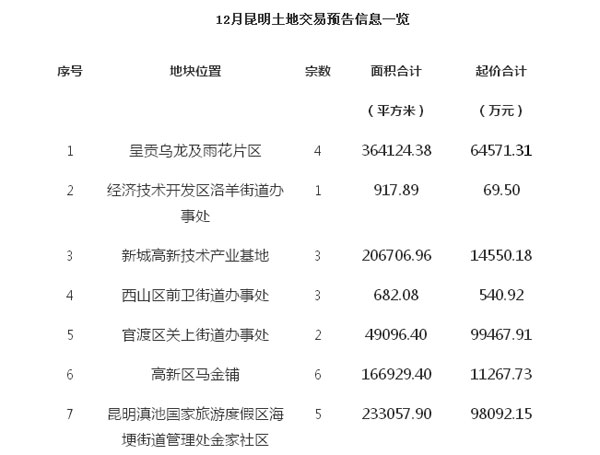 年末"翘尾" 昆明12月土地供应量已至1532.27亩