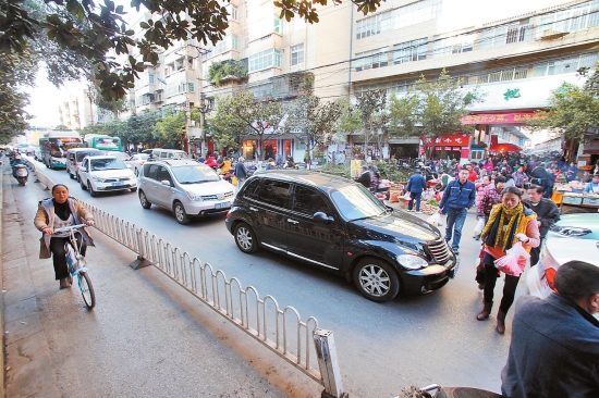 紧邻篆新农贸市场的新闻路堵车已成常态。记者周明佳/摄