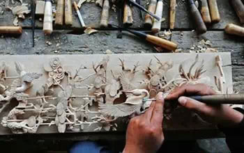 40岁的杨焕培,至今已从事木雕20多年。他也是从此类木雕班里出来的。1992年初中毕业后没读高中,当时段国梁正在另一家木器厂当厂长。厂里和县里职业高中合作办了一个木雕培训班,向社会招生,通过考试就能够进厂工作。杨焕培从此开始木雕生涯的,现在他是剑川木雕的州级传承人。