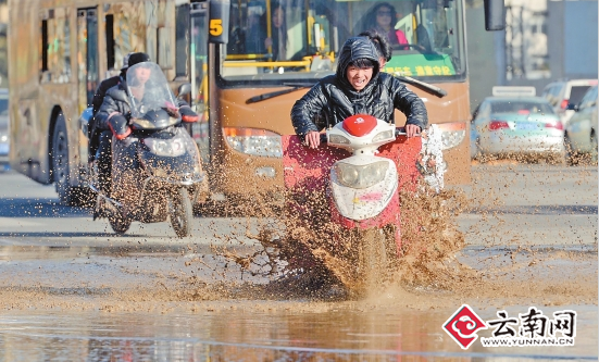 非机动车道全部被浑水淹没,深处有20多厘米,机动车道也有淹水,原本可供3辆机动车行驶的机动车道只有一个车道能正常通行,还有电动车挤占,抢道行驶。汽车碾压泡水路面,倒是无碍,但电动车快速通过时就会溅起水花,使驾车人身上沾上污水。