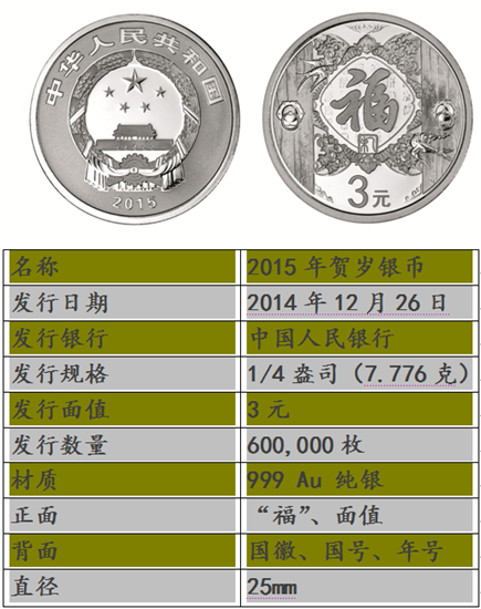 贺岁即庆贺新年,是我国特有的传统文化和民俗文化。为节日增添吉利,中国人民银行自2003年开始发行贺岁普通纪念币后,贺岁系列普通纪念币就因中国人民喜爱的主题、完美的设计、精湛的铸造工艺而成为普通纪念币板块中的精品。为了延续这一题材,中国人民银行计划2015年贺岁普制银币将于2014年12月26日发行。