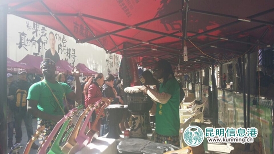 整个市集活动,还有不少现场DIY互动手作或现制学习交流的摊位店主们与逛街赶集的年轻人一起互动交流和游戏玩耍。在整个活动期间,由主办方邀请的街头艺术表演艺人们不时地表演着街头艺术,放歌一曲与路人共和,吹奏熟悉的音乐与路人共同陶醉,拍打非洲鼓与路人一起欢乐共舞,杂耍游戏、装置艺术……整条街区充满了欢乐、悦动、意趣十足的氛围。不仅吸引了年轻人的加入,更吸引了平常少见稀奇和光怪陆离的创意市集氛围的中青年甚至大龄路人们的共融。