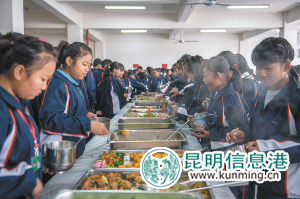 中午时分,学生们在食堂打饭,今天这一顿是自助餐。中缅双方提供的每人每月700元生活费,让这些孩子的留学之路基本无后顾之忧
