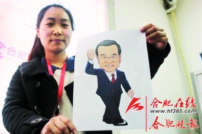 石霁手持她和黄鹤松为总理创作的漫画形象。 图片源自合肥在线。