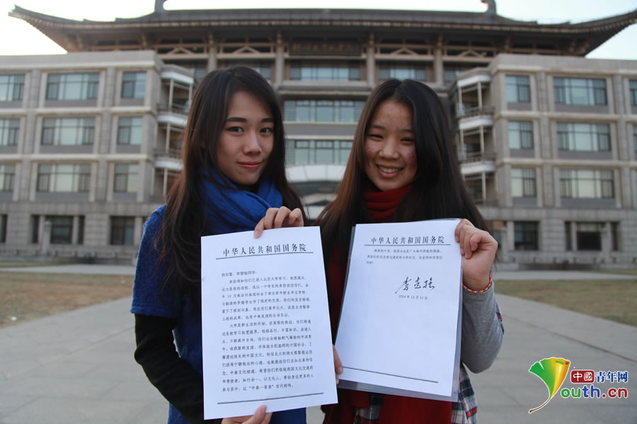 白云莹(左)、李慧敏(右)手持李克强总理的回信在北大图书馆前合影。 中国青年网记者 李延兵摄
