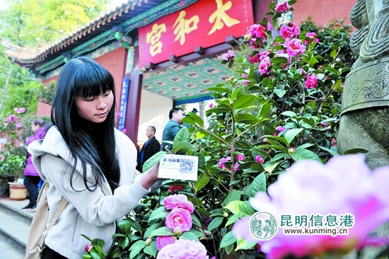 金殿名胜区拥有各类植物近3000种,其中仅茶花品种就达1200余个。为了让游客更好地了解植物相关知识,金殿名胜区携手西南林业大学、百度百科,组织20余名在校大学生来到金殿,为园内的800株园林植物佩戴了二维码标牌。此次佩戴的二维码除了云南山茶花、茶梅、金花茶、华东茶等茶属植物外,还把范围扩大至垂丝海棠、柏树、紫薇等园林植物,共有近80种植物有了“身份证”。