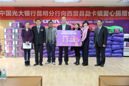 中国光大银行昆明分行一直把扶贫帮扶视为己任,认真贯彻落实云南省委、省政府“社会扶贫工作电视电话会议精神”及我国第一个“扶贫日”活动要求。除了利用信贷资源做好帮扶工作之外,还积极帮忙推动定点扶贫点普洱市西盟县勐卡镇经济社会发展,开展社会公益捐助活动,较好地履行了社会责任。
