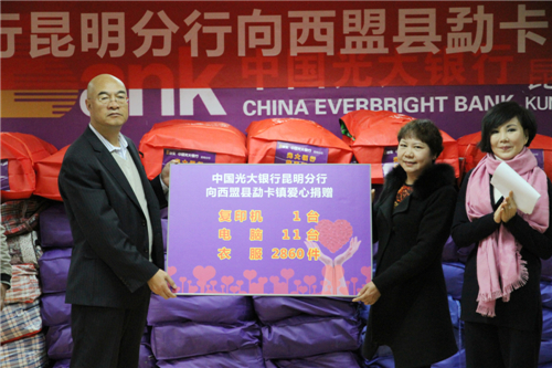 近日,中国光大银行昆明分行举行爱心捐赠仪式,将该行员工自愿捐赠的2860件衣物及11台办公电脑、1台复印机赠予定点扶贫的普洱市西盟佤族自治县勐卡镇。