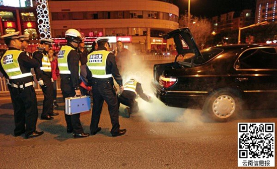 看见闪耀的警灯,男驾驶员匆忙停车与副驾女子换座;面对查处,核载8人的面包车在匝道上左摇右摆起来,原来里面坐了15个人;黑色轿车冒着浓烟驶来,交警向的哥借灭火器灭火……3月3日20时起,昆明市公安局交警支队三大队组织警力进行夜间道路交通违法整治行动,重点打击酒后驾车,没想到,酒驾没查到,突发情况却不少。